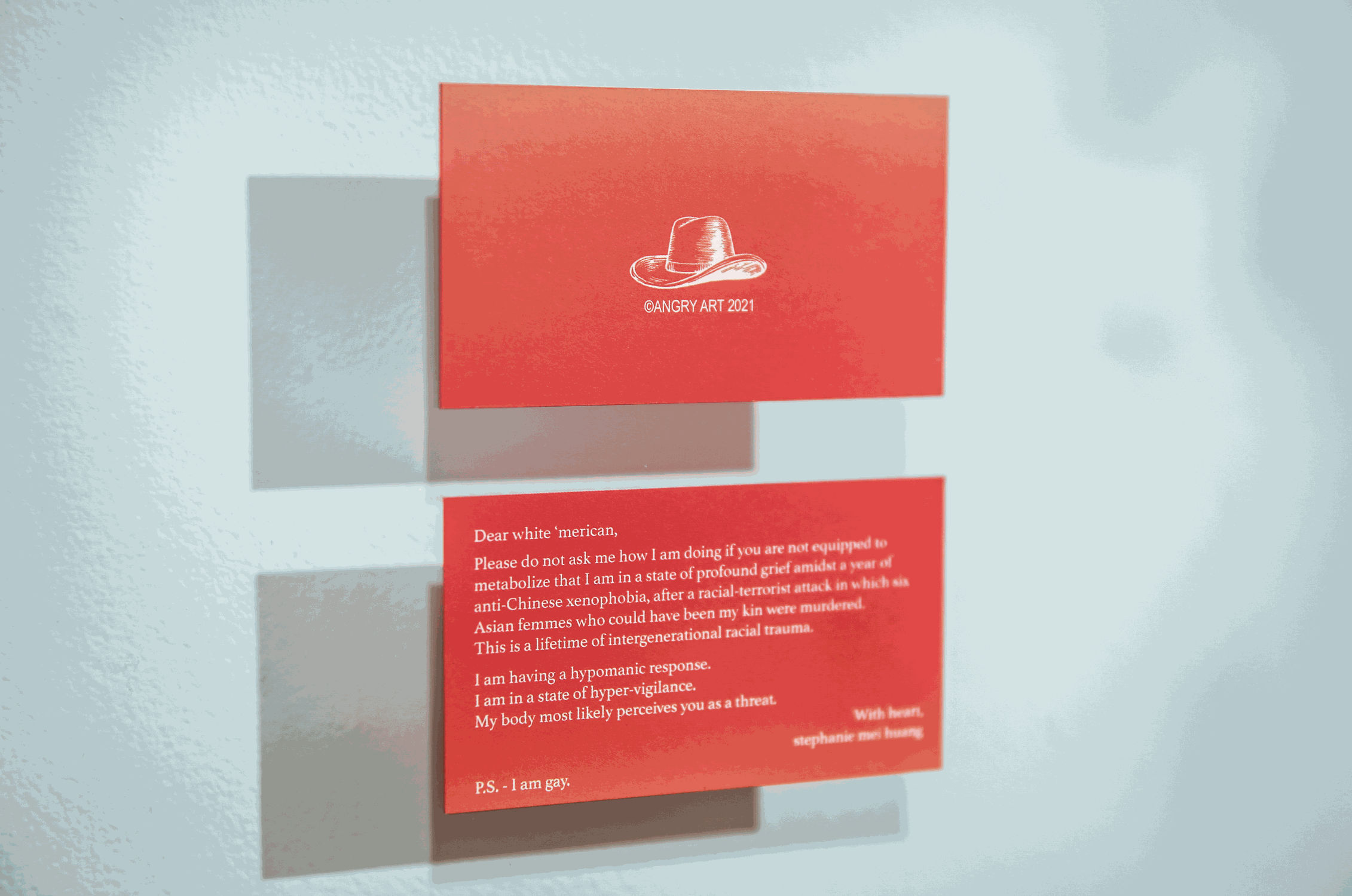 Die seit Langem andauernden tragischen Attentate in den USA vermitteln im direkten Vergleich das Gefühl, Rassismus sei in Deutschland kein akutes Thema. Doch sowohl fremdenfeindlich motivierte Angriffe wie in Rostock 1992, als auch Szenen des Alltagsrassismus zeugen vom Gegenteil. Inmitten dieser Diskussion wird man auch bei scheinbar harmlosen Themen mit der Problematik konfrontiert: Hat der Indianerkostüm bei dem Kindergartenfasching eine Berechtigung? Sind Karl Mays ausgespitzten, heroisierenden Geschichten vom Wilden Westen in der heutigen Zeit noch vertretbar? huang geht auf die soziopolitischen Fragen im globalen Kontext ein. huangs Schaffen als bildende Künstlerin begann während ihres Aufenthaltes in Marfa, Texas.